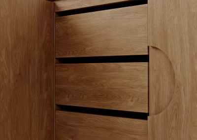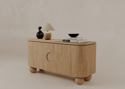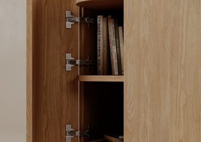 A komódban polcok találhatóak, azonban opcionálisan fiókok is kérhetőek bele BLUM fékezős vasalattal.