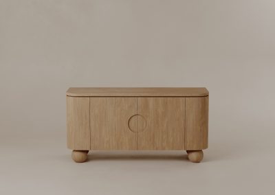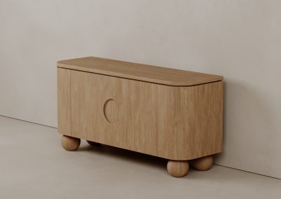Két oldalán lekerekített komód, anyagában mart fogantyúkkal, 4 db gömb lábbal.